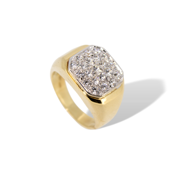 Men’s chevalier ring in 18 kt yellow gold with pavé of natural G VS diamonds – 10.00 g – 0.63 ct – Idee Preziose since 1987 A bold and timeless statement: this men’s chevalier ring in 18 kt yellow gold features a pavé of natural diamonds that adds radiance and distinction. The octagonal head and solid structure make this jewel a refined symbol of masculine elegance. Material: 18 kt yellow gold Stones: Natural diamonds Total carat weight: 0.63 ct Color: G Clarity: VS Cut: Round brilliant Weight: 10.00 g Gender: Men Brand: Idee Preziose since 1987 Style: Classic chevalier Occasions: Ceremonies, important events, bold personal style For the man who wears his confidence with sophistication.