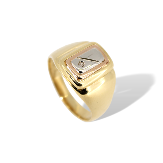 18 kt yellow and white gold men’s ring with natural G VS diamond – Idee Preziose since 1987 This refined men’s ring in 18 kt yellow gold showcases a polished finish surrounding a clean, rectangular white gold plate set with a natural round diamond. A modern classic with subtle contrasts and timeless appeal. Material: 18 kt yellow and white gold Main stone: Natural diamond Carat weight: 0.08 ct (estimated) Color: G Clarity: VS Cut: Round brilliant Gender: Men Brand: Idee Preziose since 1987 Style: Geometric minimal Occasions: Everyday wear, personal gift, understated elegance An essential design for those who appreciate contemporary simplicity.