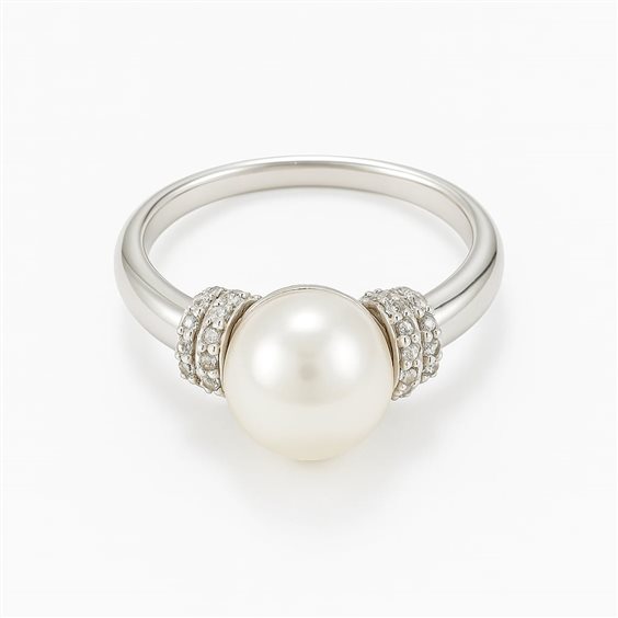 18 kt White Gold Women’s Ring with 8.20 mm Natural Pearl and Zircons – 3.20 g – Size 14 – Idee Preziose dal 1987 A jewel that balances brilliance and refinement with timeless elegance. This 18 kt white gold ring features a natural 8.20 mm pearl, luminous and perfectly round, symbolizing purity and grace. On each side of the pearl, twin bands of white zircons add sparkle and symmetry, creating a sophisticated contrast between the smooth glow of the pearl and the radiant shine of the stones. The sleek, contemporary design ensures versatility, making it a perfect choice for both everyday wear and special occasions. Material: 18 kt white gold Main stone: Natural pearl Pearl diameter: 8.20 mm Accent stones: White zircons Weight: 3.20 g Size: 14 Gender: Women Brand: Idee Preziose dal 1987 Style: Solitaire with zircon side bands Occasions: Ceremony, anniversary, elegant gift An expression of balance and light — where the glow of the pearl meets the sparkle of zircons in a jewel of timeless sophistication.