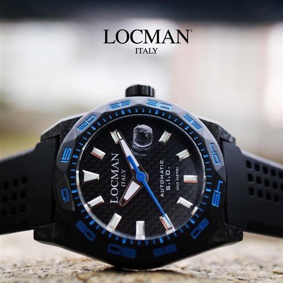 Locman Stealth 300m Automatic with carbon fiber case and dial, rubber strap, titanium backing.