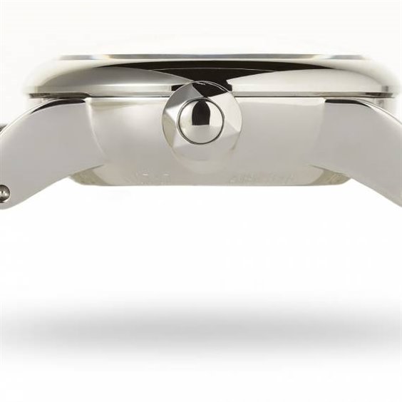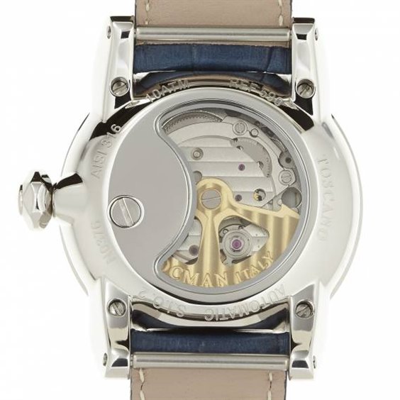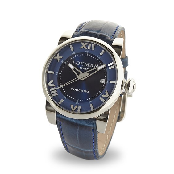 Men's watch with blue dial with applied Roman numerals, date at 3, screw crown, S.I.O. automatic movement, sapphire crystal, visible movement, waterproof 10 atm, blue leather strap with buckle closure, 2 years guarantee.