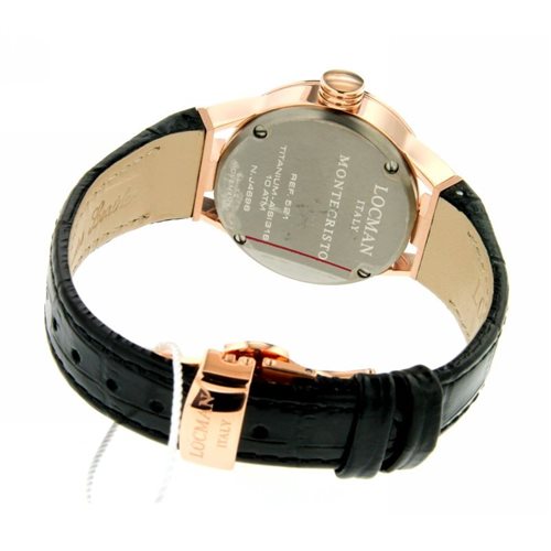 Ladies' watch, quartz time only movement, 34 mm case, rose gold PVD finish, black mother-of-pearl dial with white details, date, screw-down crown, titanium caseback with screws, serial number of production engraved on the bottom, black leather strap printed, butterfly closure with buttons.Image image, the packaging may vary in shape and color.