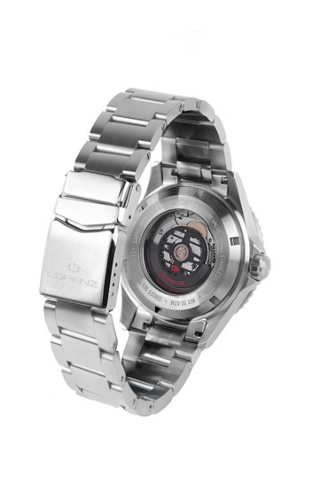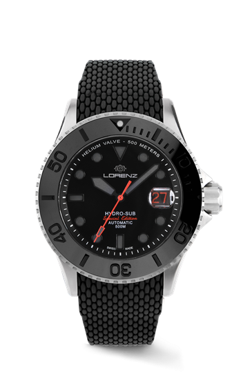 Lorenz Hydro-Sub Special Edition 090011SP – Professional Swiss Made automatic dive watch Technical Specifications Brand: Lorenz Model: Hydro-Sub Special Edition 090011SP Gender: Men's Case diameter: 43 mm Case thickness: 14 mm Lug width: 20 mm Case material: Stainless steel Bezel material: Black ceramic, unidirectional rotating Crystal: Sapphire with cyclops lens Dial: Black with luminescent indices Movement: Automatic Sellita SW200 (Swiss Made) Functions: Time only, date at 3 o'clock Case back: Screw-down Crown: Screw-down Strap: Stainless steel bracelet with wetsuit extension + spare rubber strap Clasp: Deployant with safety mechanism Water resistance: 50 ATM (500 meters) Style: Professional diver Packaging: Special leather case with magnifying glass and screwdriver included Designed for the most extreme dives, the Lorenz Hydro-Sub Special Edition 090011SP combines Swiss precision and robustness, delivering reliable performance even in the most challenging conditions.