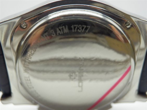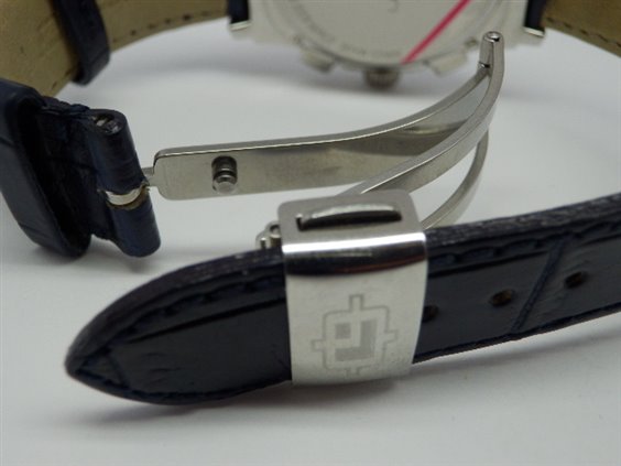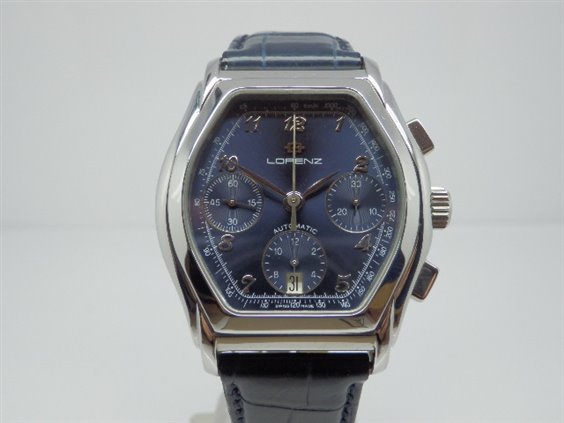 Chronograph automatic watch, ETA7750 Swiss movement with 25 jewels, blue crocodile strap, with folding clasp with silk-screened Lorenz logo. Seconds continuous on counter at 9 minutes chrono on counter at 3 o'clock and operating hours dial at 6 o'clock. Dater at 6 o'clock. Rounded hexagonal case section. 33X34