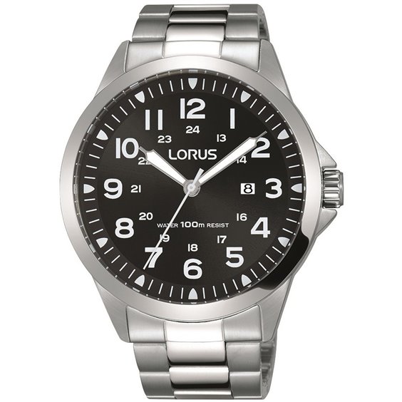 Lorus Solo Man From The Sports Collection. Only Time With Quartz Movement. Featuring Steel Case 44 Mm, With Date, Mineral Glass, Lumibrite Balls, Steel Screw Bracket and Bracelet. Water Resistance Is 10 Atm.