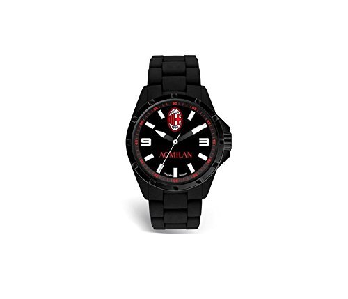 Official watch A.C.MILAN quartz only time steel case black color crown and screw cap, black dial with personalized logo and Milan lettering, black rubber strap, 5ATM.