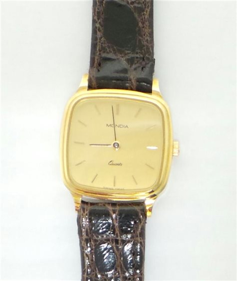 Women's watch 18 kt gold, quartz movement, gold dial, square case 21 mm, mineral glass, leather strap brown alligator.
