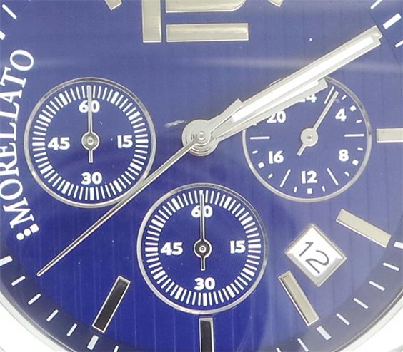 Chrono Steel Watch Blue Dial worked rows, stainless steel bracelet with clasp, natural diamond cashed on the Crown, water resistant 10 atm