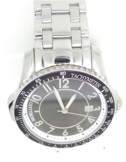 Watch 41 mm diameter steel with tachymetric scale on bezel, black dial with very legible Arabic numerals, steel bracelet with push button Deployant clasp, quartz movement
