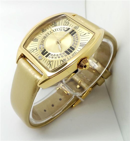Yellow gold plated stainless steel case with cubic zirconia in the quadrant, 30x30 mm, leather strap, quartz movement, Water resistant 5 atm, sapphire crystal