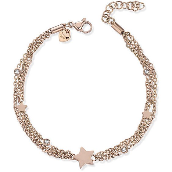 Women's Bracelet Of Ops Objects Of The Star Collection. Jewel In Rose Gold Color Steel With Small Crystals Of Transparent Color. Bracelet With 3 Chains And Pattern With Microspheres And Star-shaped Details. Jewel Of Length 17-20 Cm, Crystals: 2 Mm Stars: 9.6 × 10 Mm (Central Charm); 5 × 4.7 Mm. Jewel with Carabiner Closure