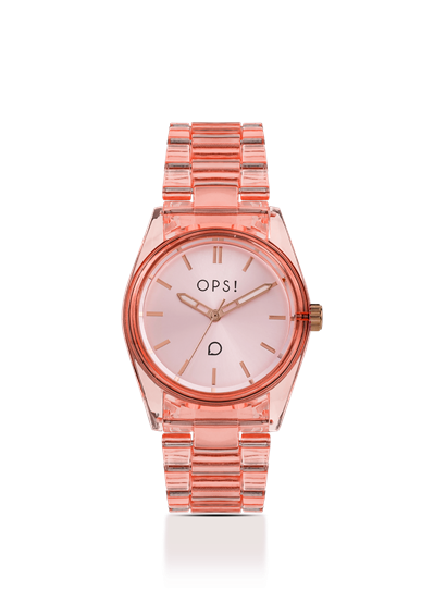 Ops Object Vivid OPSPW-1114 women’s watch 36 mm quartz 3 ATM The Ops Object Vivid OPSPW-1114 features a vibrant, colorful design with a 36 mm glossy transparent salmon pink plastic case, pink dial and matching plastic strap, combining lightness and character. The quartz movement ensures reliable daily performance, while the 3 ATM water resistance makes it suitable for everyday protected wear. This OPSPW-1114 strikes a balance between femininity and modern flair, perfect to enhance casual outfits with a bold pop of color. Technical specifications: Case material: transparent salmon pink plastic Case diameter: 36 mm Crystal: flat mineral Movement: quartz Functions: time only Water resistance: 3 ATM Strap: salmon pink plastic Gender: women Style: fashion / casual Occasions: daily wear, leisure A radiant, lightweight timepiece that speaks of bold femininity — a flash of color to brighten every moment.
