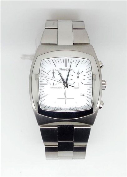 36x40 mm stainless steel case, stainless steel bracelet, quartz movement with chronograph, hard mineral glass, water resistance 50 m