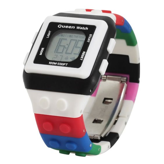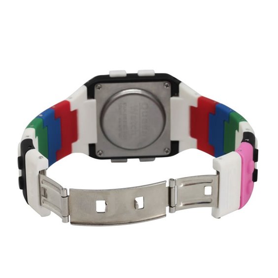 Watch with digital squared display that will add a touch of color to your wrist. The bracelet is made of soft colored rubber. A unisex model that fits both men's and women's wrists.The "Medium Size" size case (36x36 mm ) houses a dial with a stopwatch, calendar, alarm and a choice of time display in 12 / 24H format.