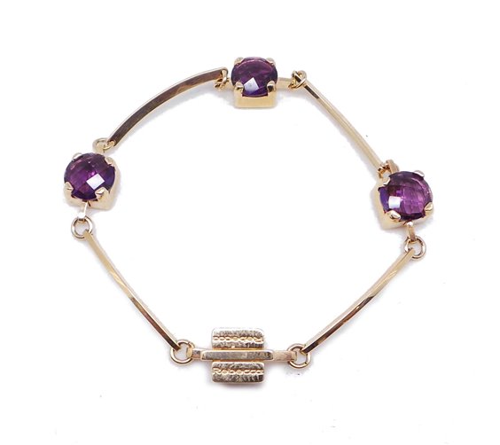 Bronze bracelet with semi-rigid three stones embedded in quartz purple. Closure snaps, length 16.5 cm.