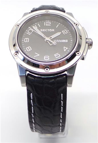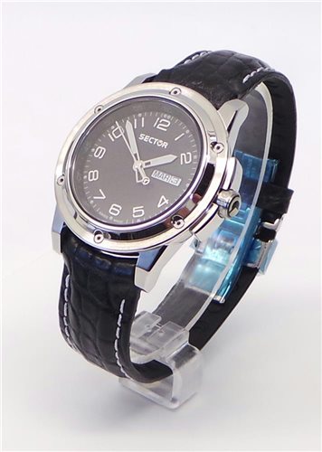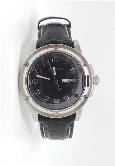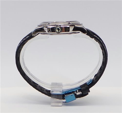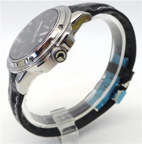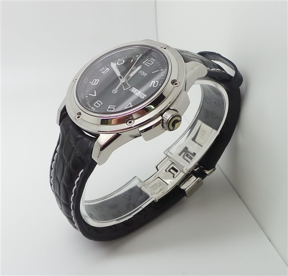 Clock Time Only. Brushed and polished stainless steel case, screw back, Ø 39 mm. thickness 10.7 mm. loop 20 mm .. Quartz Movement Made Swisse Day-Date: hours, minutes, seconds, day and date. Sapphire crystal. Matt black dial, guilloche center, digits and hands (luminor) blue ink. Adjustable strap leather, rubberized inside, stainless steel buckle deplayante. Waterproof 100 meters. Total weight 76 grams.