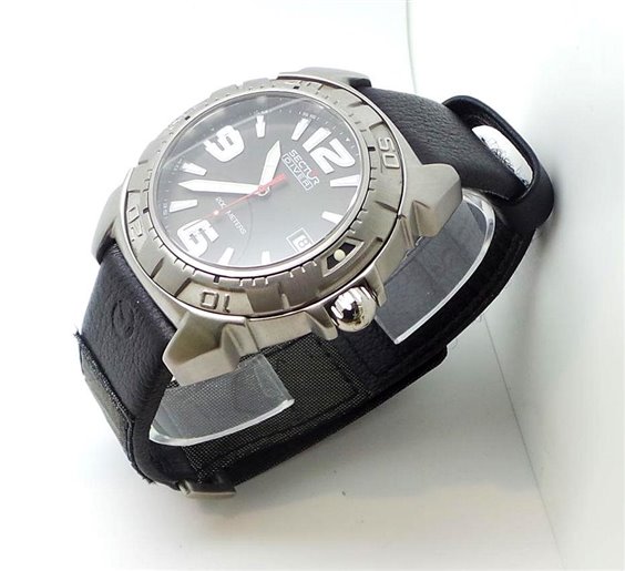 43 mm stainless steel case, leather strap and fabric strap, quartz movement, sapphire crystal, water resistance 200 m