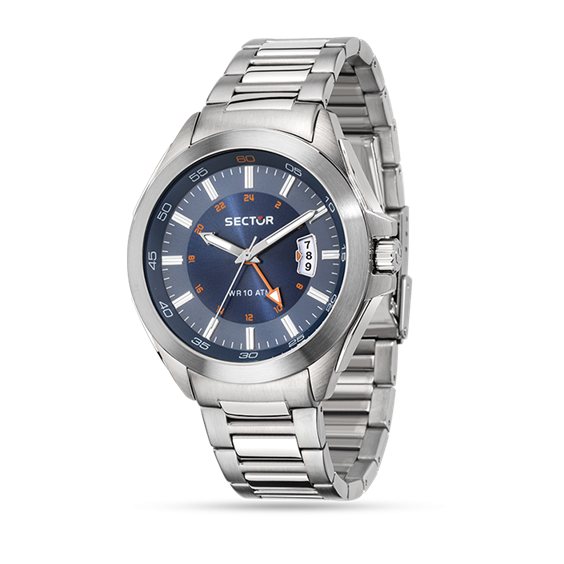 SECTOR WATCH MEN, THREE BALLS WITH MOVEMENT GMT. CASE IS IN STEEL WITH BLUE DIAL COLOR SUNRAY. THE SHAPE OF THE WATCH CASE is ROUND, SIZE 44 MM AND RIDING A MINERAL GLASS. THE BRACELET IS IN STEEL with folding clasp. WATER RESISTANT 10 ATM.