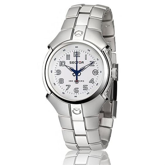 Aluminum and steel men's watch, quartz movement Miyota GM 10, with date, 36 mm case, white dial, screw back, hands tritium treated, scratch resistant mineral glass, foldover clasp.