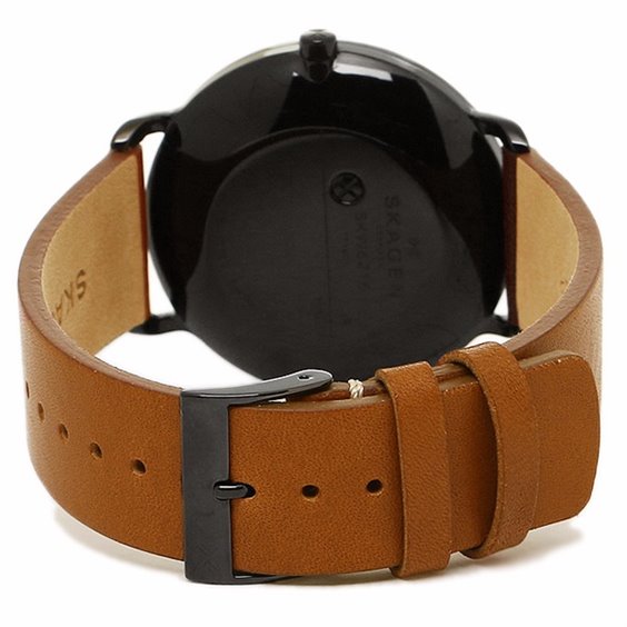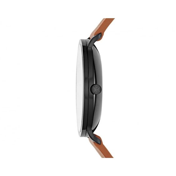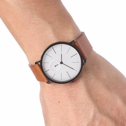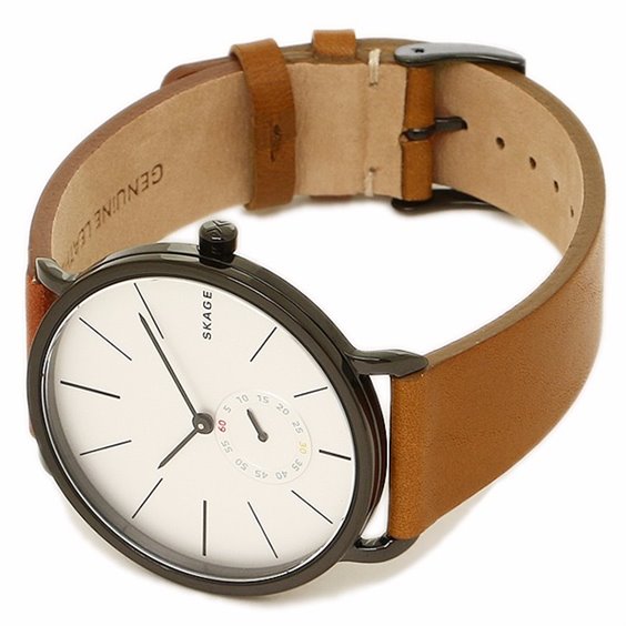 Watch with black steel case 40mm diameter, white dial, quartz movement with small seconds, leather strap, waterproof 5 atm.