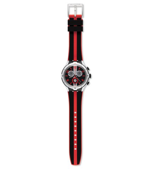 SWATCH brand since 1983 world leader in the category. Irony Xlite line watch, with aluminum case with black plastic inserts and buttons, black and red vertical striped silicone strap, chronograph function and date at 6 o'clock.