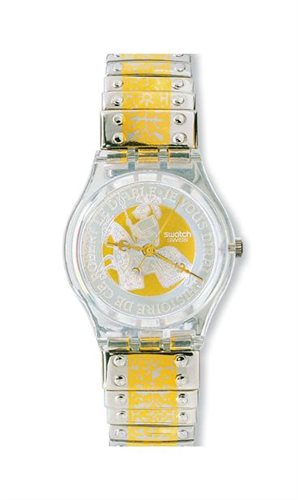 Swatch watch multicolor dial, quartz movement, two-tone metal elastic bracelet.