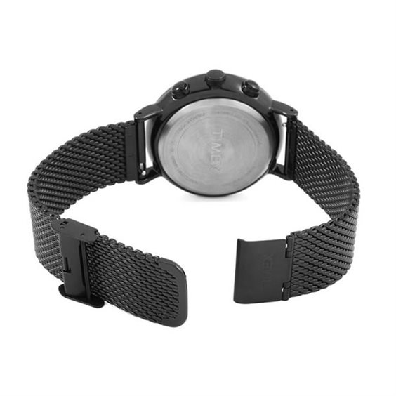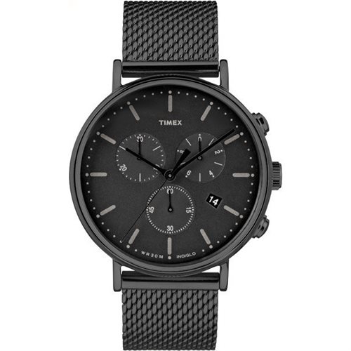 Unisex Timex Chronograph Watch from the Fairfield Chronograph Collection. Model With Case Of Black Color In Round Metal, Of Diameter Of 41 Mm And Indexes To Notches. This watch has a black mesh strap in black color. The resistance to water is 30 meters and the movement is analogue quartz. The illumination is of the Indiglo type. Date: Yes.