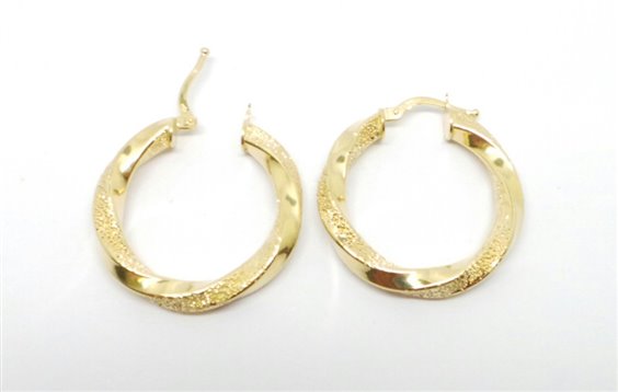 Twisted circle earrings half shiny and half satin finish with pin and dropout. tube thickness 3 mm outside diameter 25 mm. certificate of guarantee