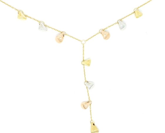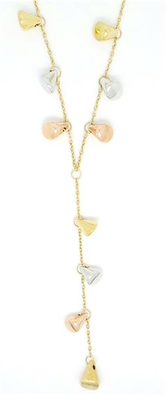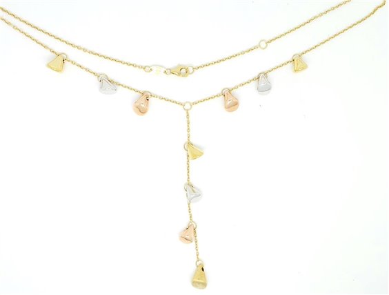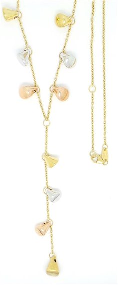 GOLD NECKLACE 750/°°° with PROCESSING chain ROLO, with SHINY GOLD DROPS in the THREE COLOURS RED-white-yellow 6 MM DIAMETER. The NECKLACE MEASURES 45 CM LENGTH with ADJUSTABLE RING to SHORTEN. PENDANT DROPS 9 CM with the SAME workmanship and FINISH with a SLIGHTLY bigger DROP with HAMMERED SATIN and PROCESSING. TOTAL WEIGHT 8.5