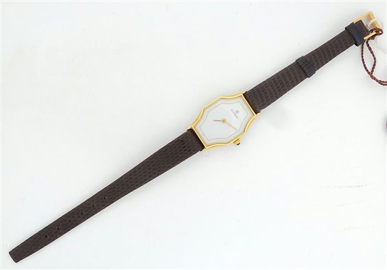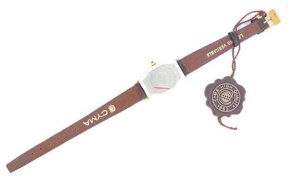 Cyma woman with mechanical movement with manual winding only time, steel case gold plated yellow 21 x 28 mm, snap crown and strap lizard dark brown. 2 years warranty.
