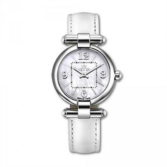 Just time watch, quartz movement Miyota 2025. Polished stainless steel case diameter 30 mm. Mother of pearl dial with applied Arabic numerals and indices, white quartz cabochon on the crown and loop, sapphire crystal. WR 10 atm, painted glossy white leather strap.