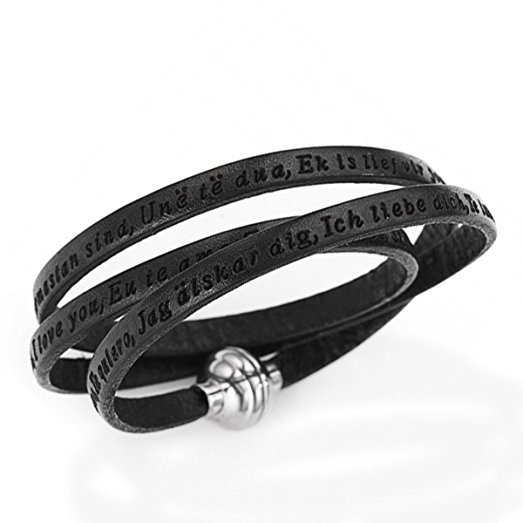 AMEN PULSERA EN CUERO, TE AMO EN TODOS LOS IDIOMAS DEL MUNDO, COLOR NEGRO, LONGITUD 57 CM