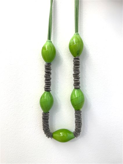 Collar hecho de cinco cuentas de cristal de Murano soplado a mano y en forma de mano por expertos artesanos venecianos para obtener una forma ovoide. Como separadores de anillos, se usan anillos de resorte de acero completamente analérgicos. La cadena del collar es de satén y el cierre es un botón de madreperla natural.