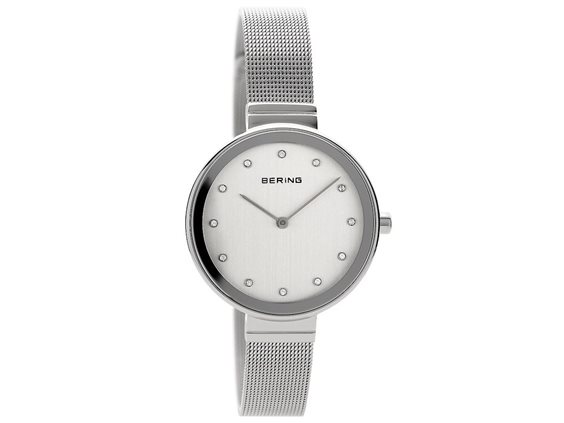 Mujer de Bering reloj, colección clásica, con movimiento de cuarzo, sólo el tiempo, caja de acero, color blanco esfera con los elementos, milanaise correa de color plateado, de línea de 34 mm, cristal de zafiro, 3 atm_Cassa de acero de diámetro 34 mm.