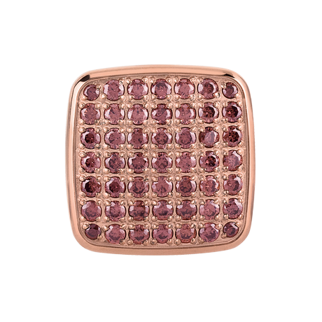 Forma de cojín en acero con tratamiento ipè rosé y pavimento de zircon de corte brillante ahumado, tamaño GRANDE (14x14 mm). Compatible con todas las bases de Breil Stone. Sistema de acoplamiento y liberación magnético.