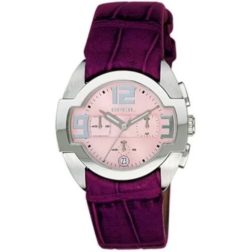 Reloj Breil Chrono Liberty, caja de acero de 35,15 x 29,20 mm, correa de piel morada con estampado de cocodrilo, esfera rosa con fecha, cristal de zafiro. Movimiento de cuarzo, cronógrafo, resistente al agua 50 mt.