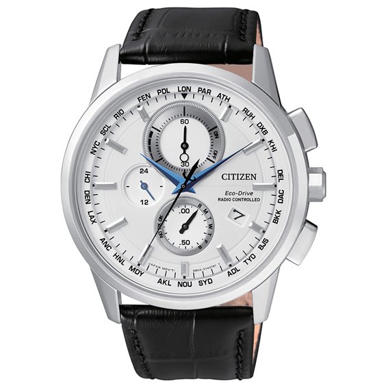 Eco drive reloj con radio control de 5 canales, recepción de señal desde EE. UU., Europa, Japón y China, reserva de marcha de 24 meses, temporizador mundial con 26 ciudades del mundo, calendario perpetuo, indicador de estado de carga, acero inoxidable, pulsera de punto de acero inoxidable Milan con cierre de botón, cristal de zafiro resistente a la abrasión, esfera azul con índices aplicados, Tamaño 44 mm x 12 mm. WR 10 bar.