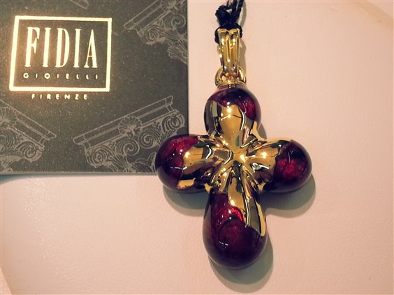 Colgante de la cruz de 18 kt oro amarillo. y el esmalte rojo. Longitud del colgante excluidos anillo cm. 4 cm y anchura. 3 - cm de espesor. 1