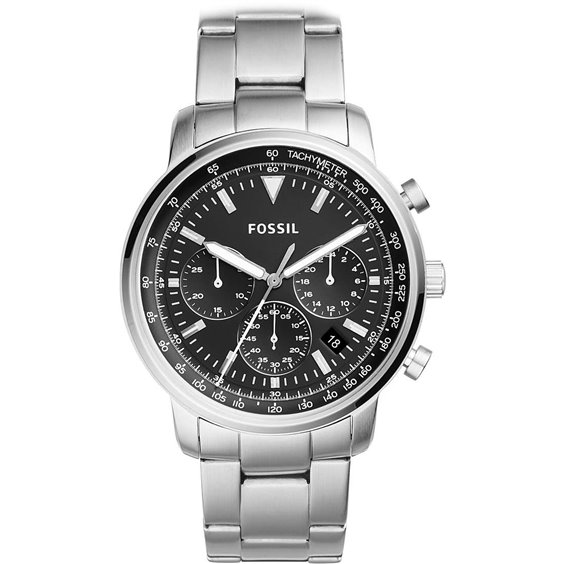 Reloj cronógrafo Fossil para hombre de la colección Goodwin Chrono. Modelo con caja redonda de acero inoxidable color plata y acabado satinado y brillante. Caja de Diámetro de 44 Mm y de Grosor de 11 Mm. El anillo está hecho de acero inoxidable plateado con acabado brillante, esfera negra y vidrio transparente. Reloj con pulsera de acero inoxidable plateado con acabado satinado y cierre desplegable. La distancia de las curvas es de 22 mm. Reloj con movimiento de cuarzo con cronógrafo y resistencia al agua de 5 atm. GARANTÍA DE CAJA ORIGINAL.