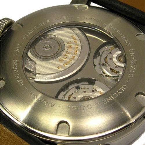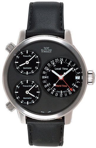 GLYCINE AIRMAN ANIMATED RELOJ MODELO de tres con movimientos automáticos de las cuatro zonas TIEMPO NEGRO INDICACIÓN DIAL con las horas Fecha 3 acero inoxidable de diámetro 53 mm IMPERMEABLES 5 ATM FONDO VITRE'CON MOVIMIENTOS una vista.