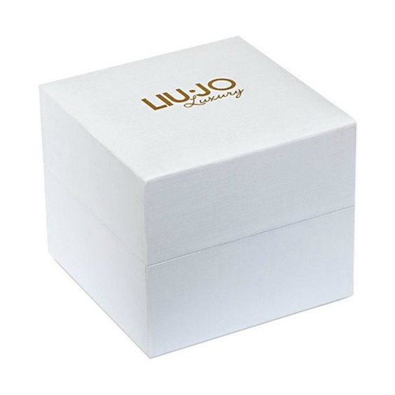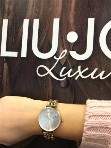Reloj Liu Jo en delicado acero dorado, cristal mineral, caja redonda con esfera metálica blanca y agujas doradas. Corona y almohadilla de presión. Correa de acero chapado en oro de 14 mm con cierre autocortante.