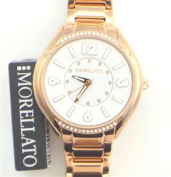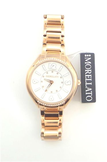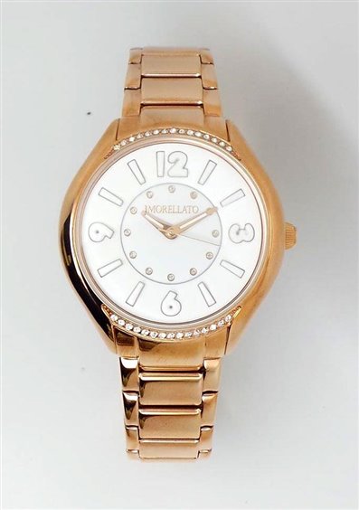 Caja de acero 38 mm, oro rosa PVD tratamiento con circonitas Pulsera de acero, movimiento de cuarzo, vidrio mineral duro, resistencia al agua 50 m.