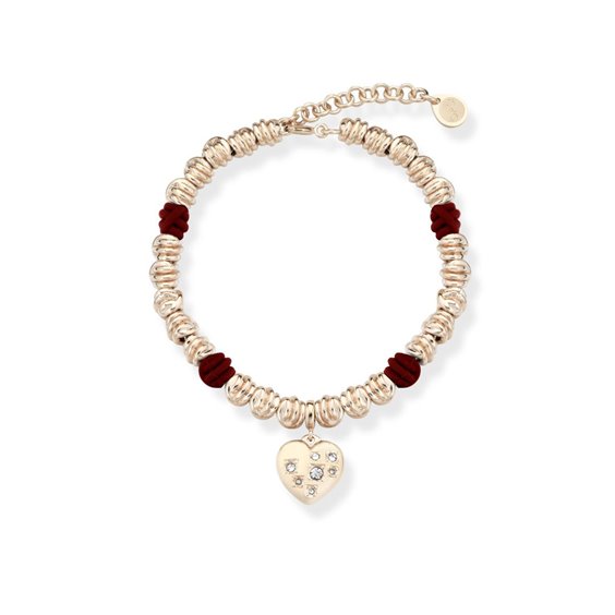 Pulsera de mujer de latón y silicona con n. 26 nudos en latón rosa dorado y n. 4 nudos en silicona rojo oscuro. La pulsera tiene un colgante de corazón de acero rosa con n. ¡7 cristales y medalla de acero dorado con el logo de OPS!