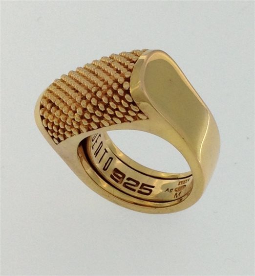 Anillo de plata PIXEL con baño de oro 18kt (0.08 micras). Mida "M" (del No. 14 al No. 17). sistema de ajuste del anillo de resorte: dos aletas ajustables permiten el ajuste del tamaño del anillo.