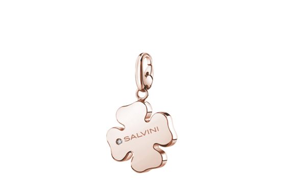 Encantos en forma de trébol de cuatro hojas en plata dorada rosa con diamante y mosquetón para aplicación en el brazalete de la colección Encantos del amor.