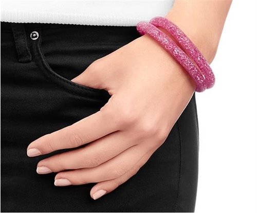 Femenina y muy moderna, la joya se puede usar doble como una pulsera envolvente, o como una gargantilla. El tubo de malla de nylon rosa 3D contiene una miríada de diminutos cristales tono sobre tono. La creación se completa con un práctico cierre magnético en metal dorado rosa y está disponible en dos longitudes.
