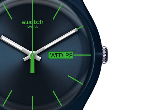 Estuche de plástico semitransparente azul con esfera azul soleada e índices de color verde brillante, con indicación de fecha a las 3 en punto. La correa es de silicona azul suave con hebilla a juego. CAJA DE GARANTÍA.