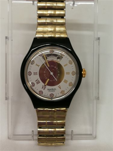 Reloj de colección privado con garantía del minorista, nuevo producto nunca usado. Pulsera de metal elástico en color amarillo dorado.