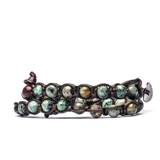 La turquesa africana es una de las piedras más antiguas, hermosa y rica en misterio. En el antiguo Egipto, se reconoció que esta piedra tenía el poder de purificar y proteger, por lo que se usaba para recipientes de comida y bebida. Los cuencos de los faraones estaban en turquesa africana debido a la creencia de que preservaba la salud del soberano de las infecciones. enfermedades, pero también de energías negativas. Original pulsera tamashii tibetana hecha con piedras naturales TURCESE AFRICAN. Todas similares a la versión clásica pero largas con dos vueltas de muñecas. Unisex y una talla (la pulsera está diseñada para adaptarse a cualquier diámetro de la muñeca).