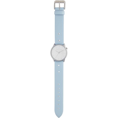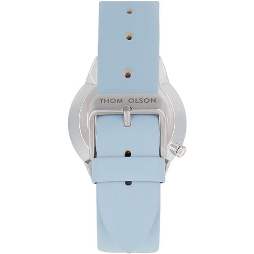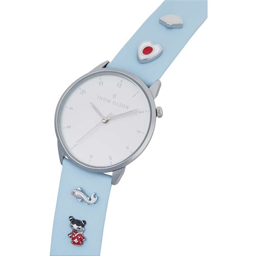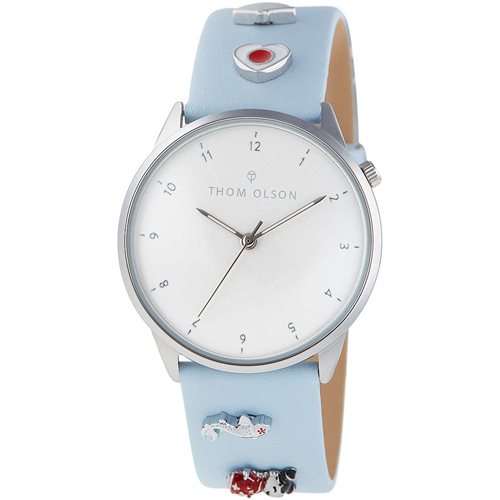 Producto: Thom Olson Chisai CBTO022 Only Time Woman Watch Thom Olson Only Time Watch De la colección Chisai, modelo Blue Geisha. El reloj tiene una caja con un diámetro de 34 mm en plata, la esfera es blanca con un asa de 18 mm. Este modelo tiene una correa de piel, color azul con hebilla en color plata. La correa está enriquecida con cuatro encantos en forma de símbolos japoneses: abanico, bandera, carpa Koil con circonitas blancas y rojas, Gheisha, latón y acero. El reloj tiene un movimiento Seiko Vj21, una resistencia de 3 Atm Water y Japan Seizaiken Sr621W Battery. La referencia es cbto022